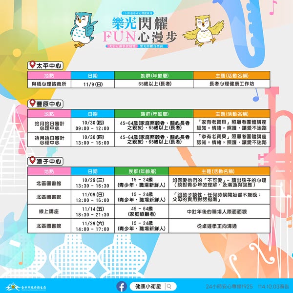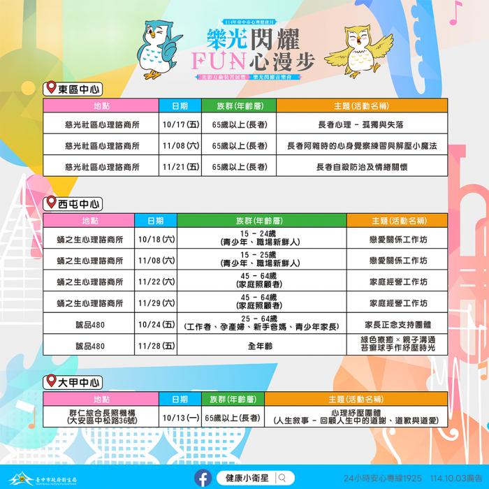 臺中市各社區心理衛生中心於10–11月推出一系列心理健康講座及活動![]()
