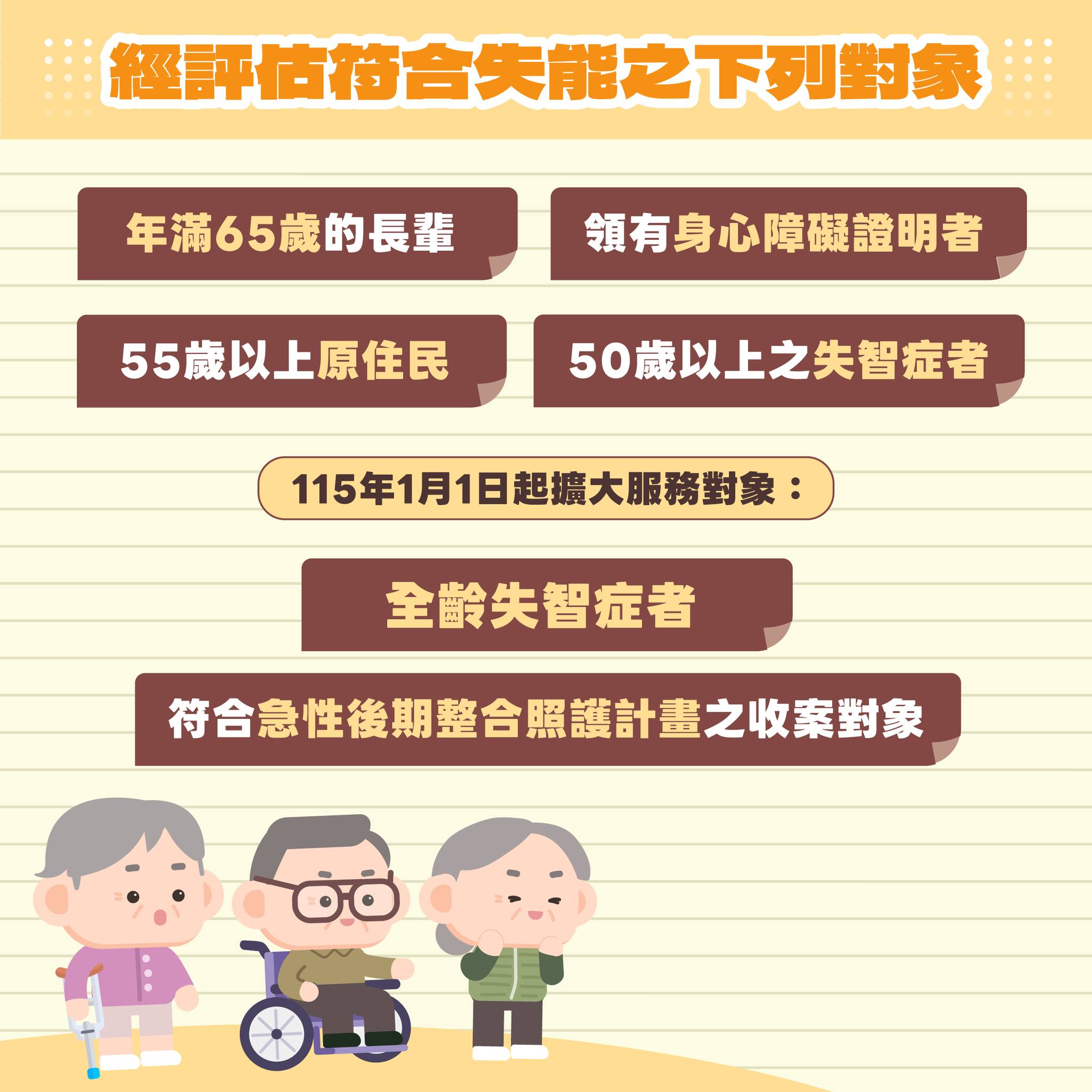 由醫療專業人員或照管專員與病患、家屬溝通,提供照顧資訊,如果有長照需求也符合資格,直接可在醫院內評估長照服務需求。